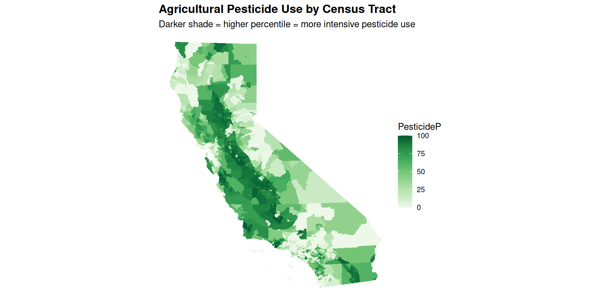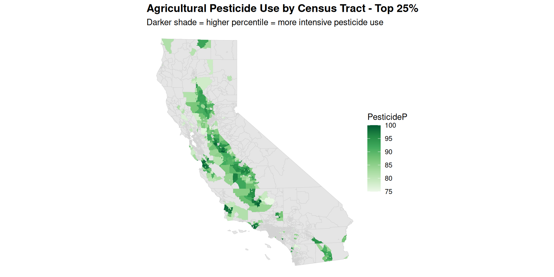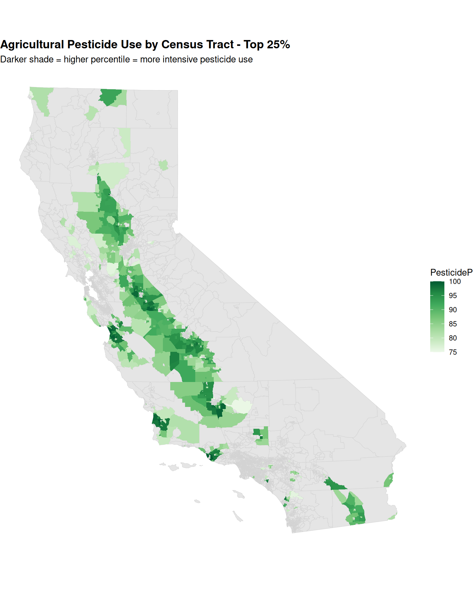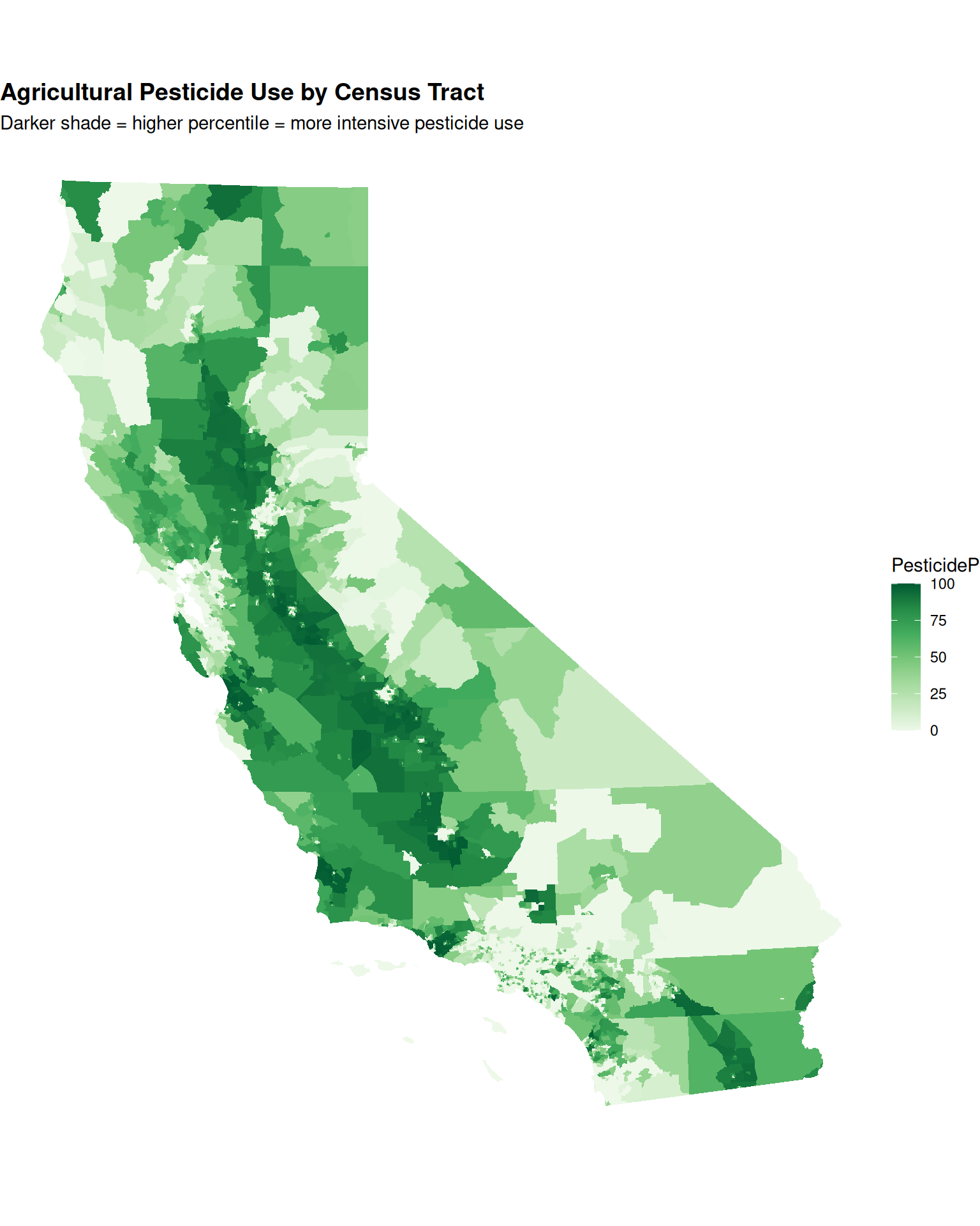 ggplot() +geom_sf(ces, color ="lightgray", mapping =aes()) +geom_sf(ces %>%filter(PesticideP >=75), color ="white", linewidth =0.001,mapping =aes(fill = PesticideP)) +scale_fill_distiller(palette ="Greens",direction =1) +geom_sf(safer_ra_as_sf %>%filter(CURRENT_FAILING =="Failing"), colour ="darkred",alpha =0.5, mapping =aes()) +labs(title ="Pesticide Use and Failing Water Systems") + plotTheme