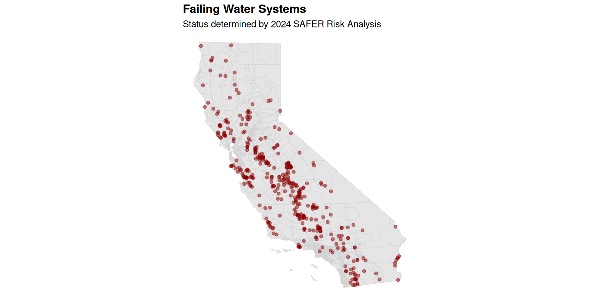 As of 2024, California had 220 failing drinking water systems serving nearly half a million people.