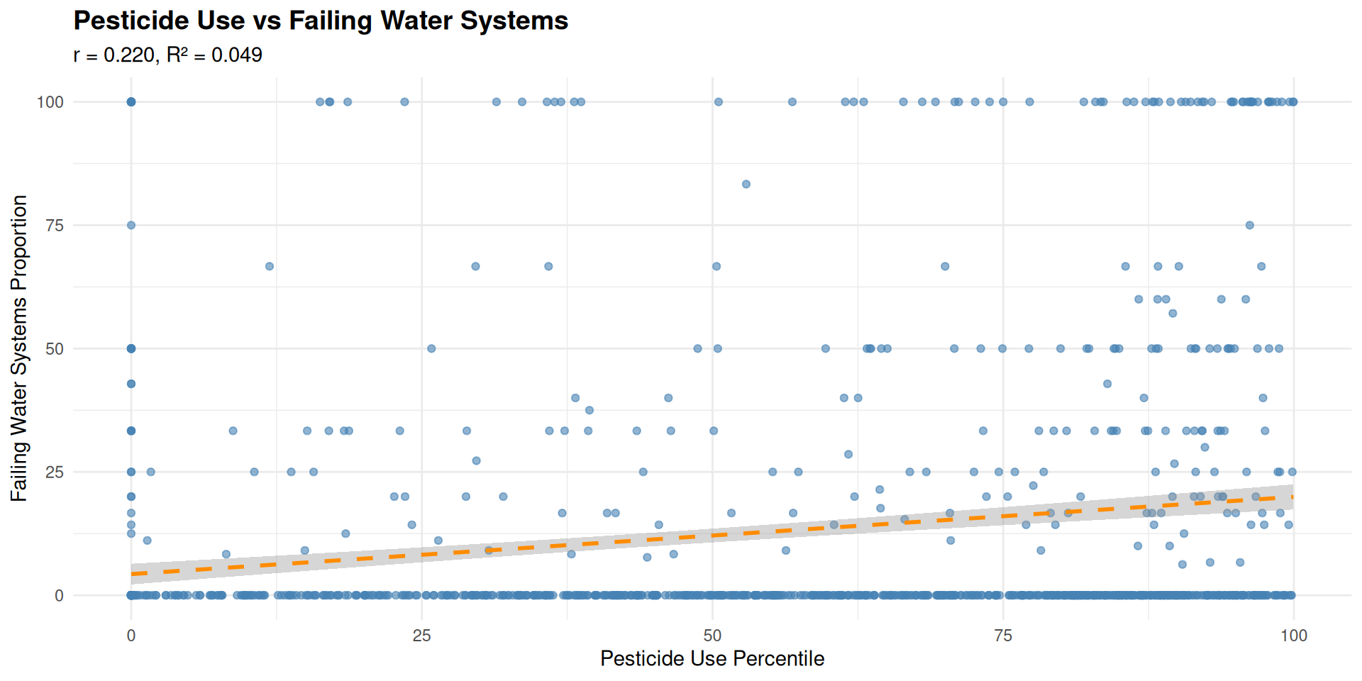 We can see a relationship, but how strong is it? Let’s do a quick statistical analysis to see whether there’s a significant relationship between pesticide use and failing water systems.