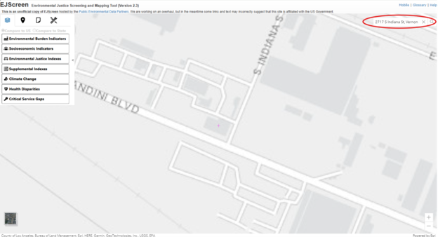 In EJScreen, you can enter the address of the site, 2717 South Indiana St., Vernon, CA to find the location on the map.