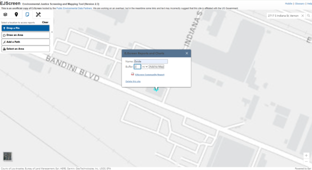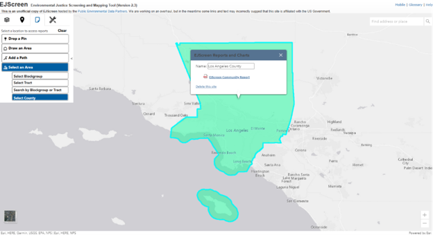 Scroll out to view the selected boundary and the pop-up window to generate reports. Repeat Step 4 to generate an EJScreen Community Report for Los Angeles County.