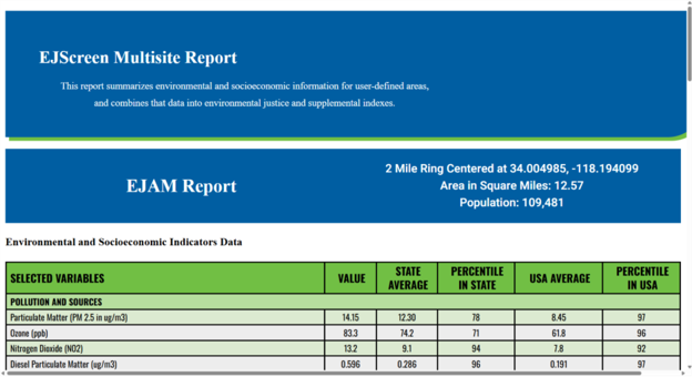 Click ‘EJScreen Community Report’ to generate a report in a new browser tab. The report shows the area and population of the user-specified area in the header, and the main body shows statistics on environmental burdens and socioeconomics.