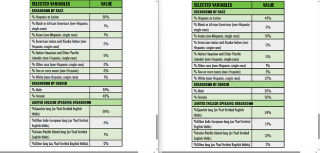 Below are reports for the area around Exide (left) and Los Angeles County (right). When comparing the reports, we can see that Exide area is 96% Hispanic, compared to 49% for the county, which indicates that residents near Exide are disproportionately Hispanic.