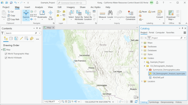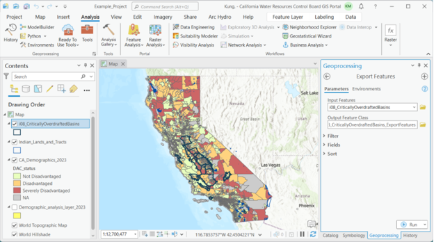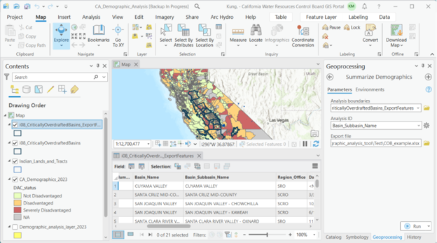 In the stepwise walk through below, we will set up and run the Summarize Demographics GIS tool to answer some general questions about equity and language outreach. We will use critically overdrafted basins as defined by the Sustainable Groundwater Management Act (SGMA) as our example.