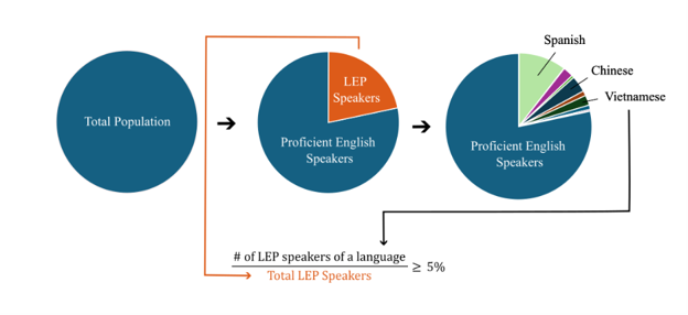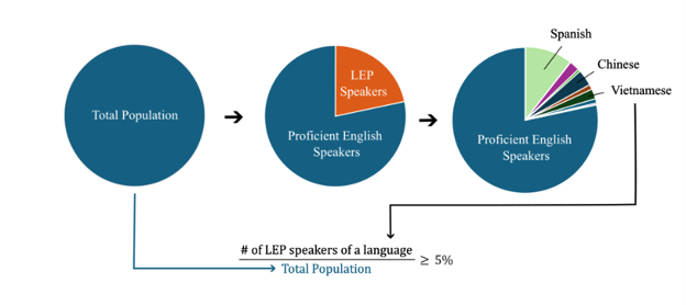 Of the total population in the area of interest, if the percentage of limited English proficiency (LEP) speakers of a particular language is greater or equal to 5%, then vital documents must be translated to that language. This calculation can be expressed as: