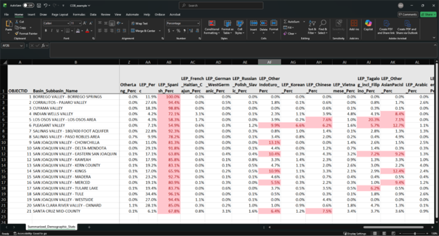 Let’s say we’re curious if certain racial groups in critically overdrafted basins are overrepresented, and how many would be considered Disadvantaged Communities. With the results table from the Summarize Demographics Tool, we can do a simple analysis using conditional formatting in Excel to highlight values in the race percentage columns that are greater than the average values for the state of California.