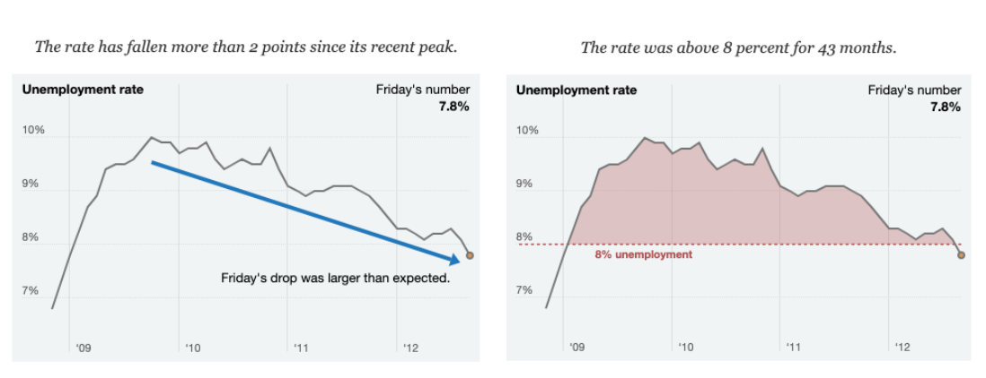 The graphic below, from Data Feminism, illustrates how the same data can tell different stories depending on their presentation. The graphic on the left tells a story of how the unemployment rate has fallen substantially since its recent peak and might be interpreted as “good news”. The graphic on the right tells a story of how the unemployment rate has been consistently above 8% for a long time period and might be interpreted as “bad news”.